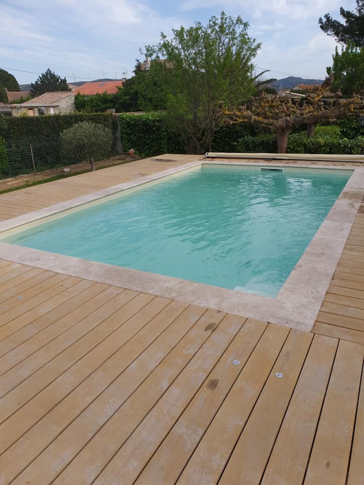 Piscine béton 4×2,5m avec volet immergé + plage ipé à Narbonne